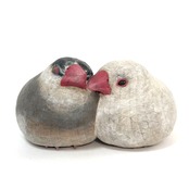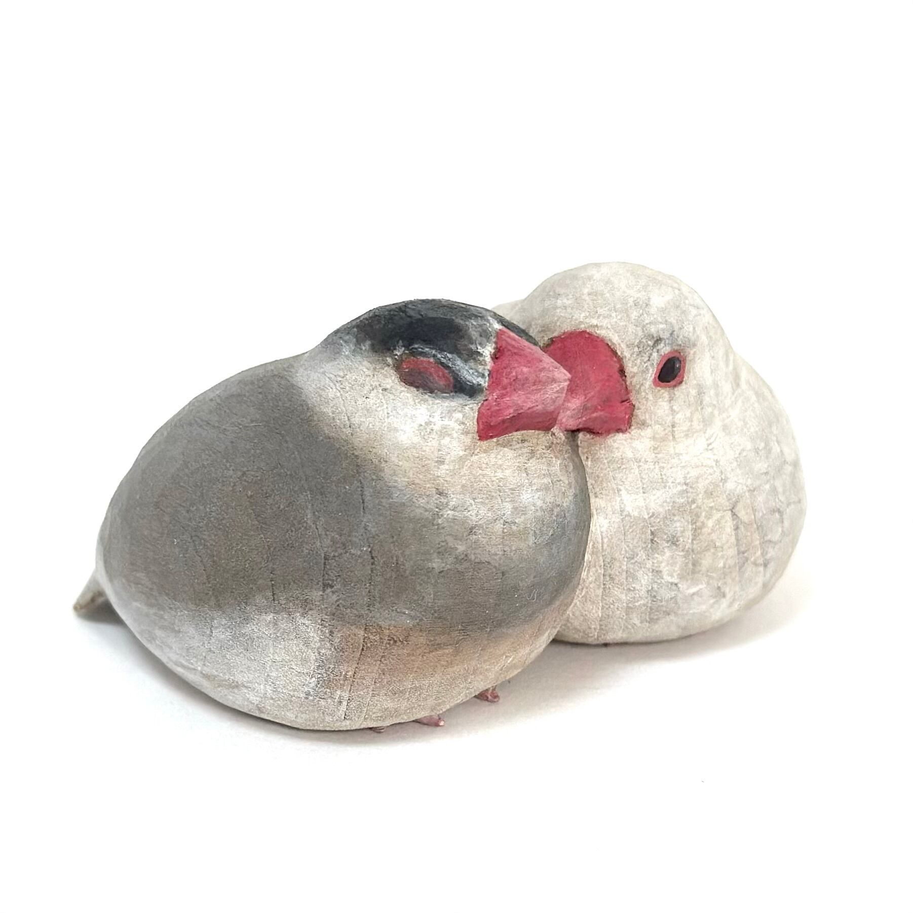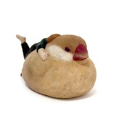 These are wooden sculptures of small Java Sparrows, with their owner riding on a large Java Sparrow.