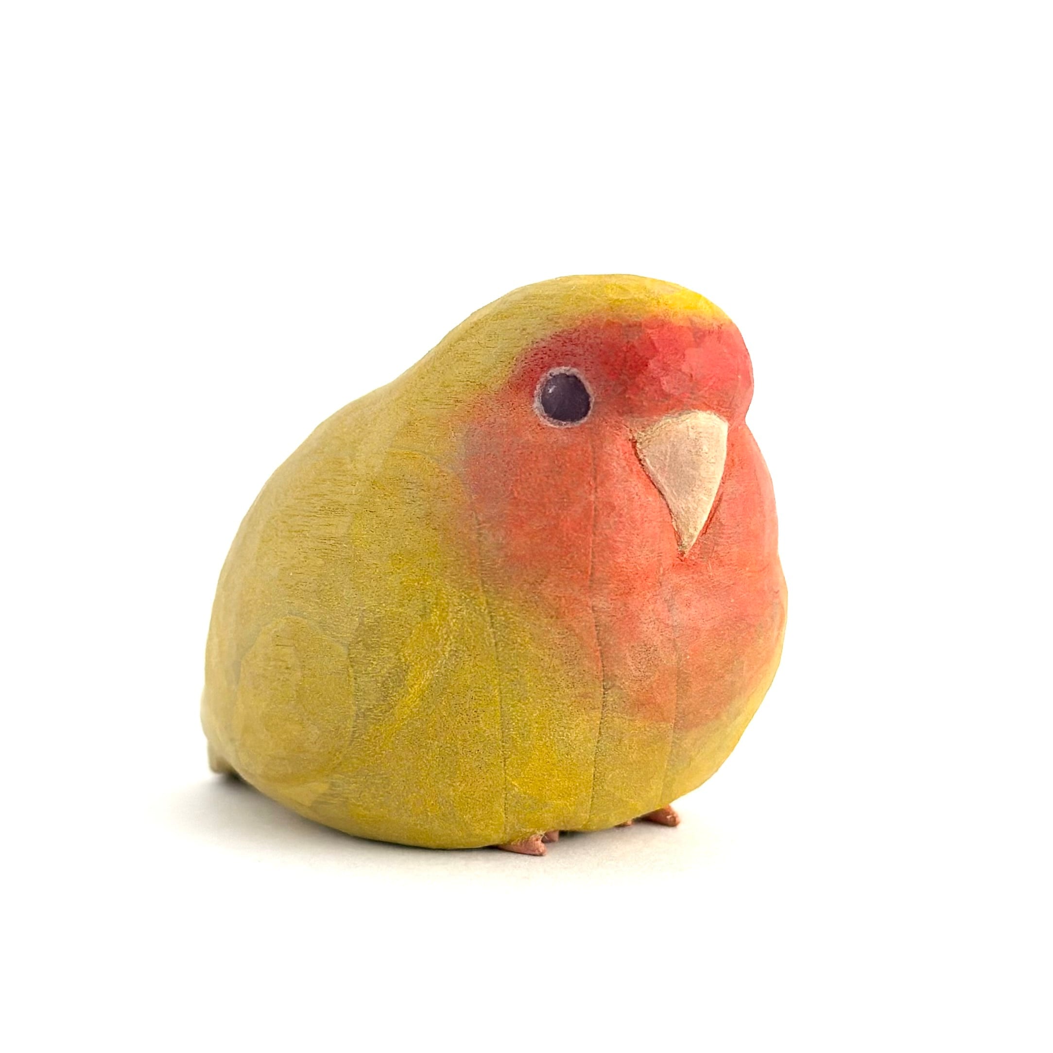 A handcrafted wooden sculpture of a yellow Peach-faced Lovebird.