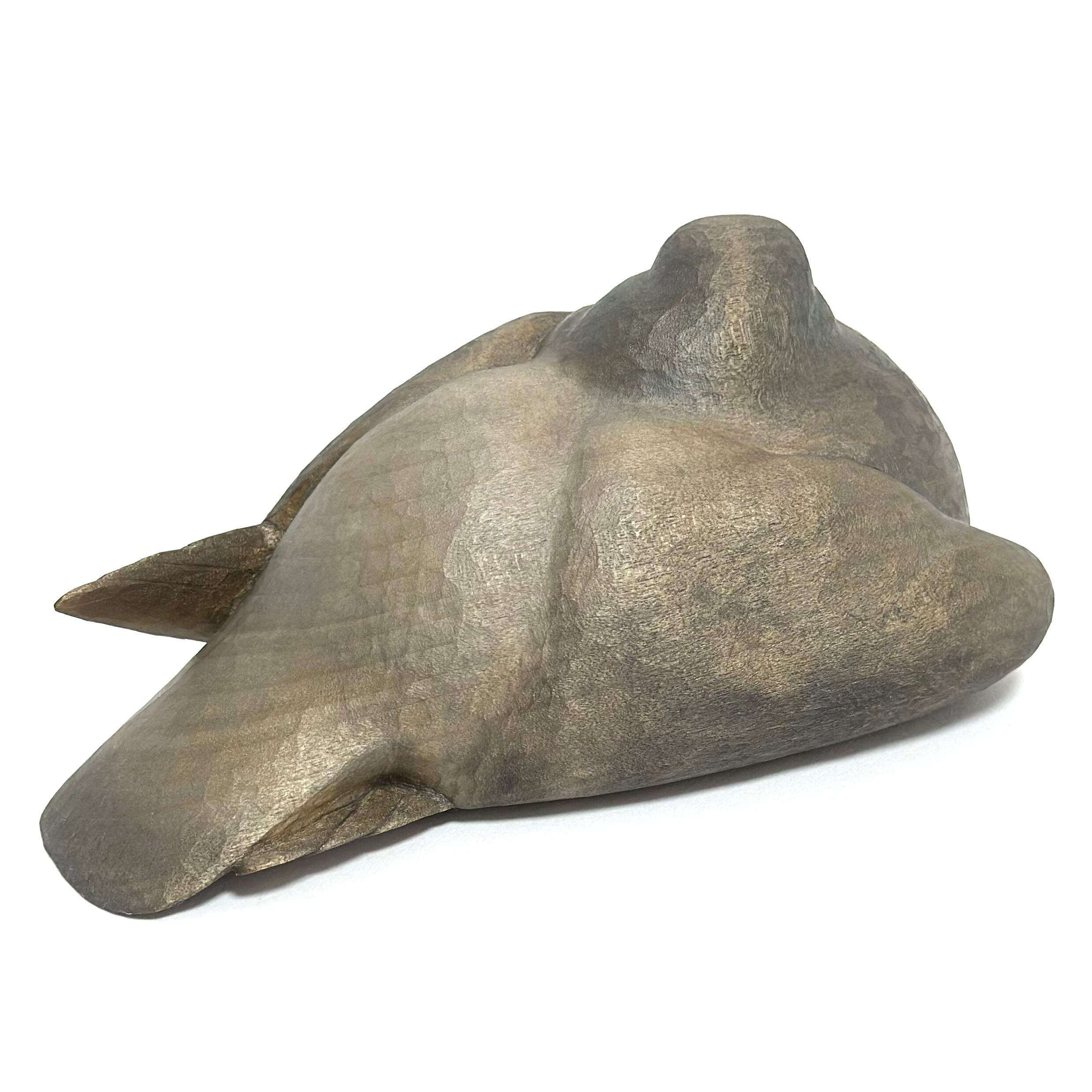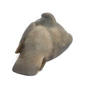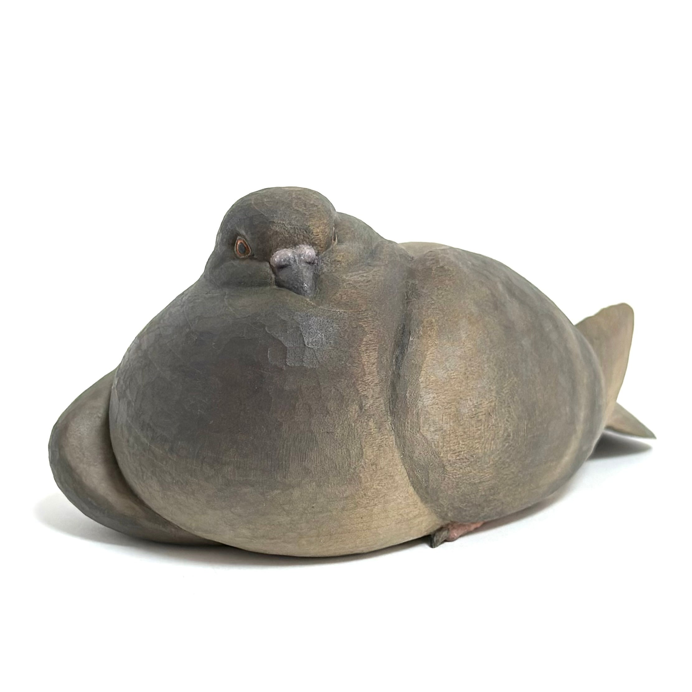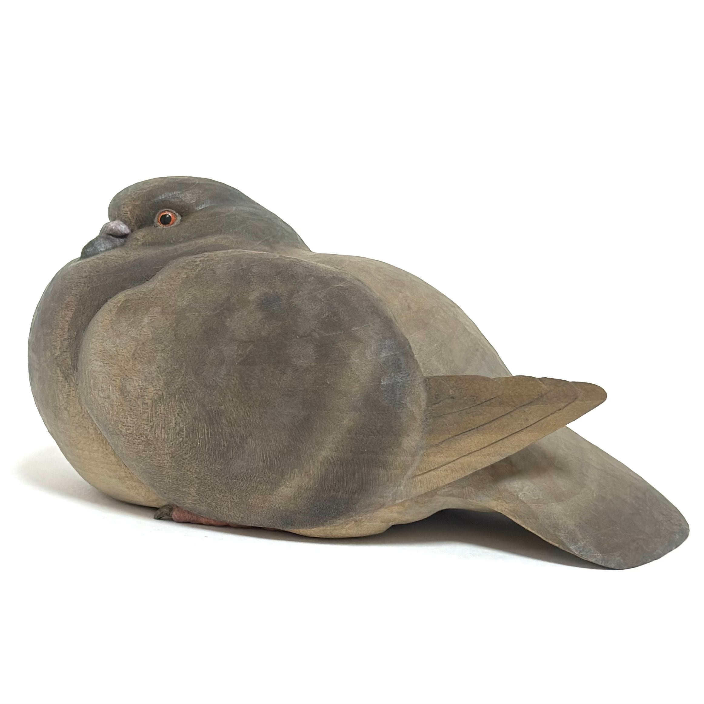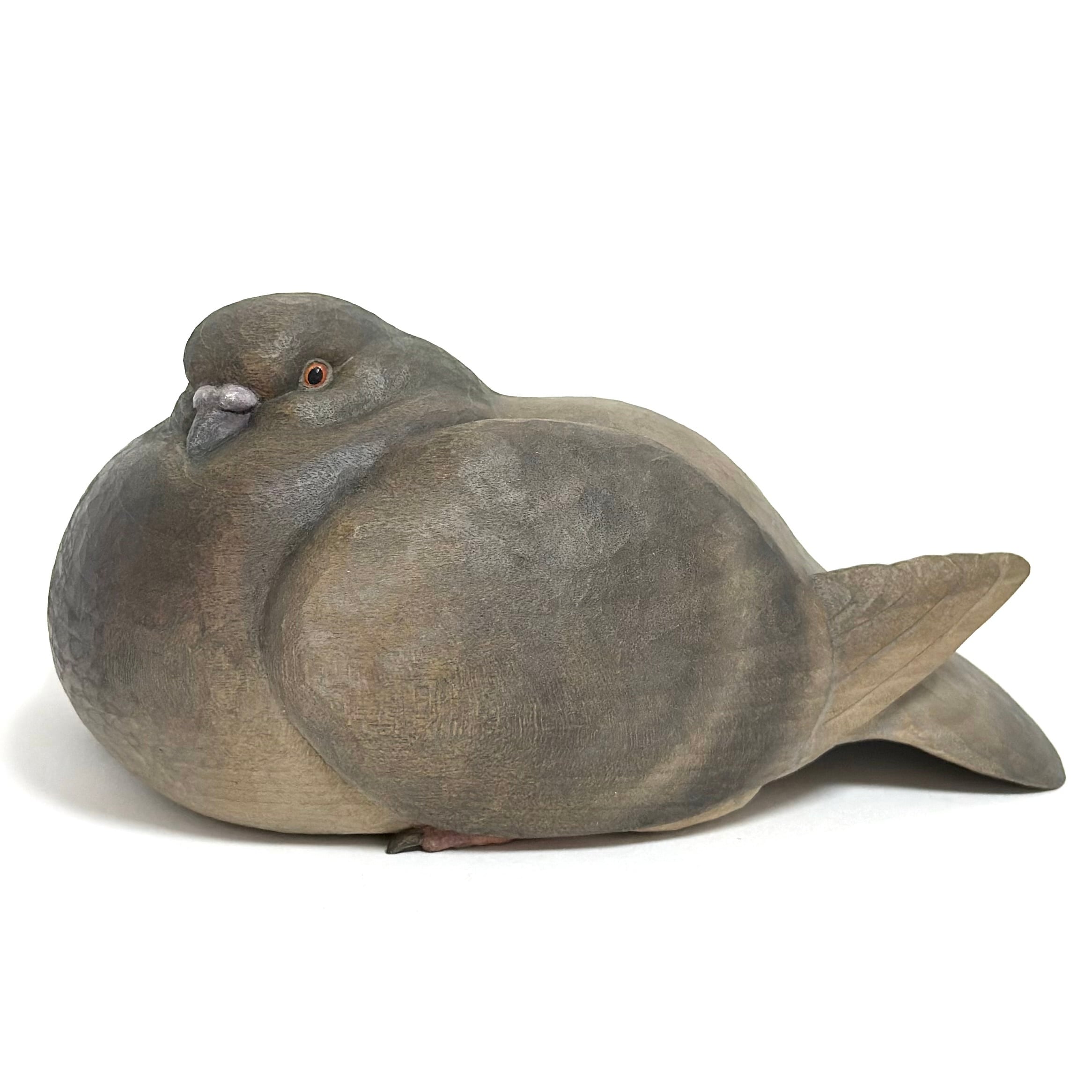 A wooden sculpture of a relaxed pigeon.