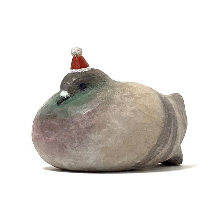 サンタ帽を乗せたドバトの木彫りです。