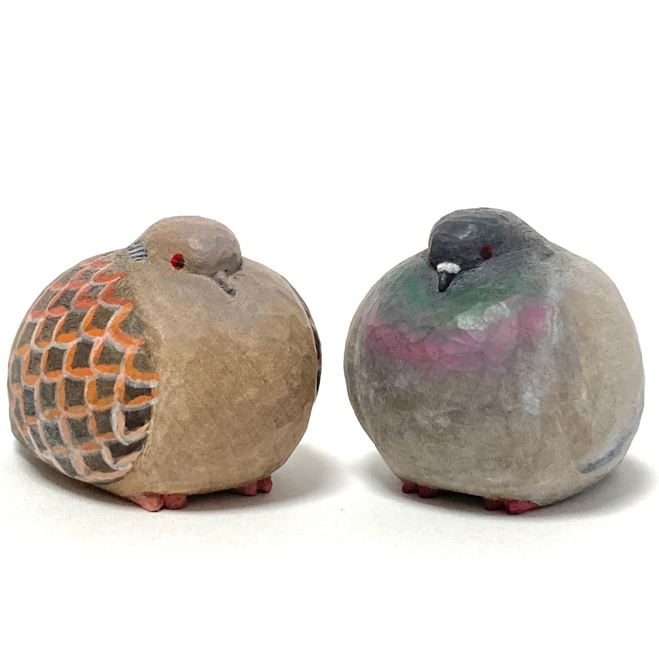 キジバトとドバトが丸くなっている様子の木彫りです。